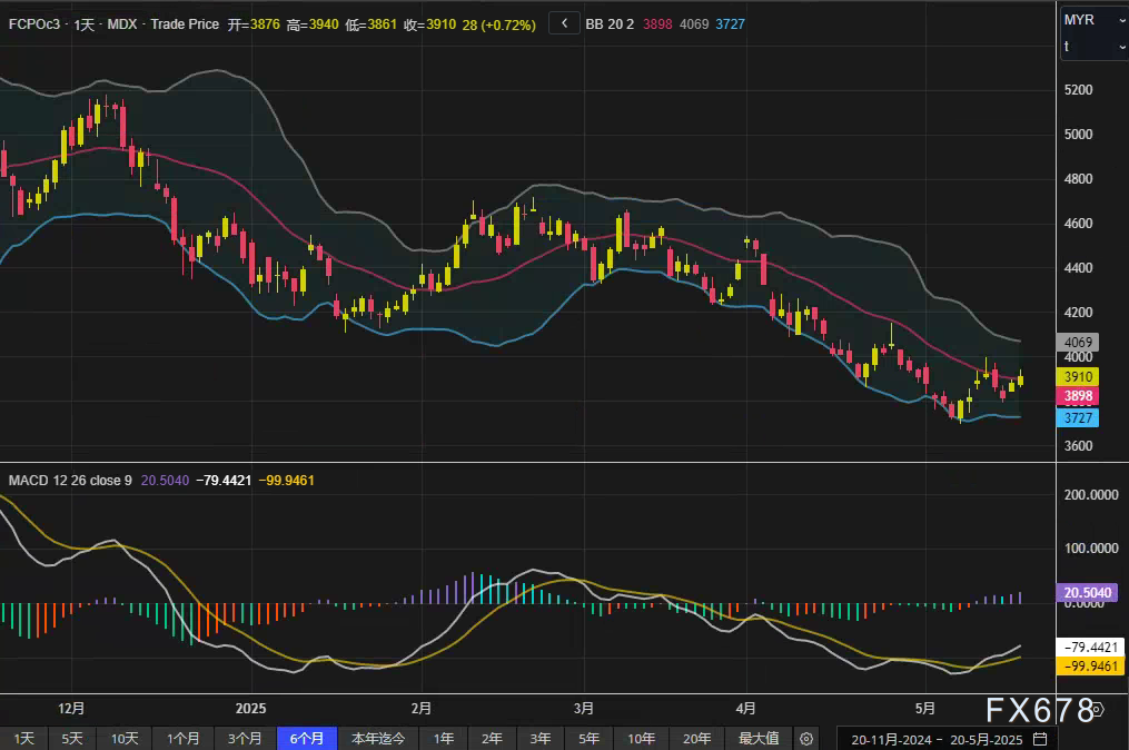 日K线技术面显示,布林带(20,2)上轨4069林吉特,中轨3898林吉特,下轨3727林吉特,价格站稳中轨,显示短线企稳迹象。MACD指标(12,26,9)快线20.5040,慢线-79.4421,柱状线-99.9461,负值区域柱状线收窄,暗示下跌动能减弱。,表明反弹动能未形成趋势性反转。