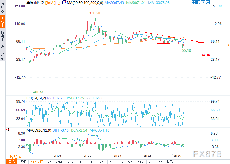 WTI原油期货周线图显示,价格从近2年的对称三角形中向下突破,这预示着非常看跌的目标价位约为34美元。