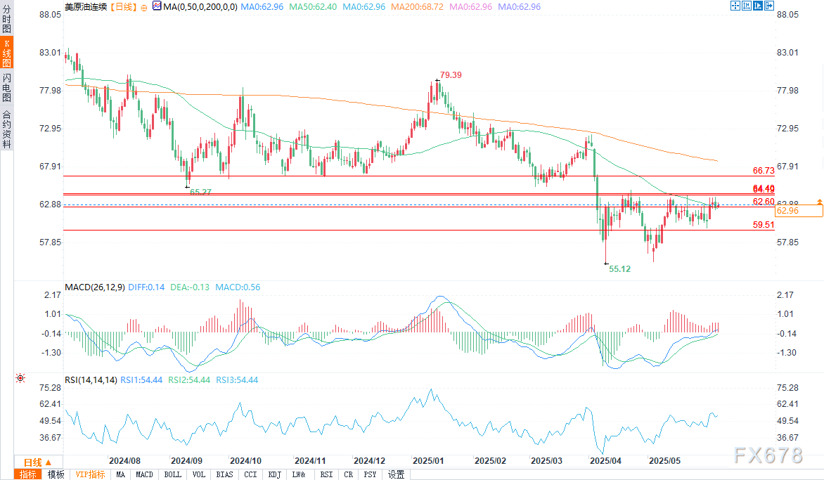 周四(6月5日)欧盘时段,WTI原油期货小幅上涨,随着市场遭遇技术阻力且需求担忧加剧,近期涨势正在消退。价格仍高于50日移动平均线62.40美元。然而,涨势在63.96美元处停滞,略低于64.19美元和64.40美元的关键阻力位。若升破这些水平,可能为向200日移动平均线68.72美元迈进开辟道路。若缺乏后续跟进,市场可能面临在62.59美元至59.51美元之间的更低枢轴区间波动的风险。