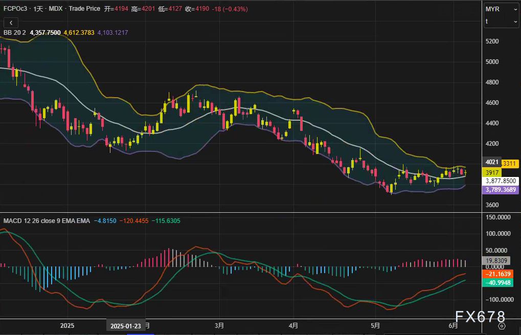 周五(6月6日),尽管马来西亚棕榈油产量与库存数据持续施压,市场仍以韧性姿态收官本周。截至今日收盘,Bursa Malaysia衍生品交易所8月基准合约FCPOc3报收3,917林吉特/吨,单日涨幅0.36%,周线累计上涨1.01%,实现连续第四周收阳。盘中合约一度下探,但尾盘买盘涌入推动价格逆转。技术面显示,布林通道(20,2)中轨位于4,357林吉特,MACD柱状图虽维持负值区域(-4.8150),但快慢线收敛迹象明显,暗示短期动能或有反复。