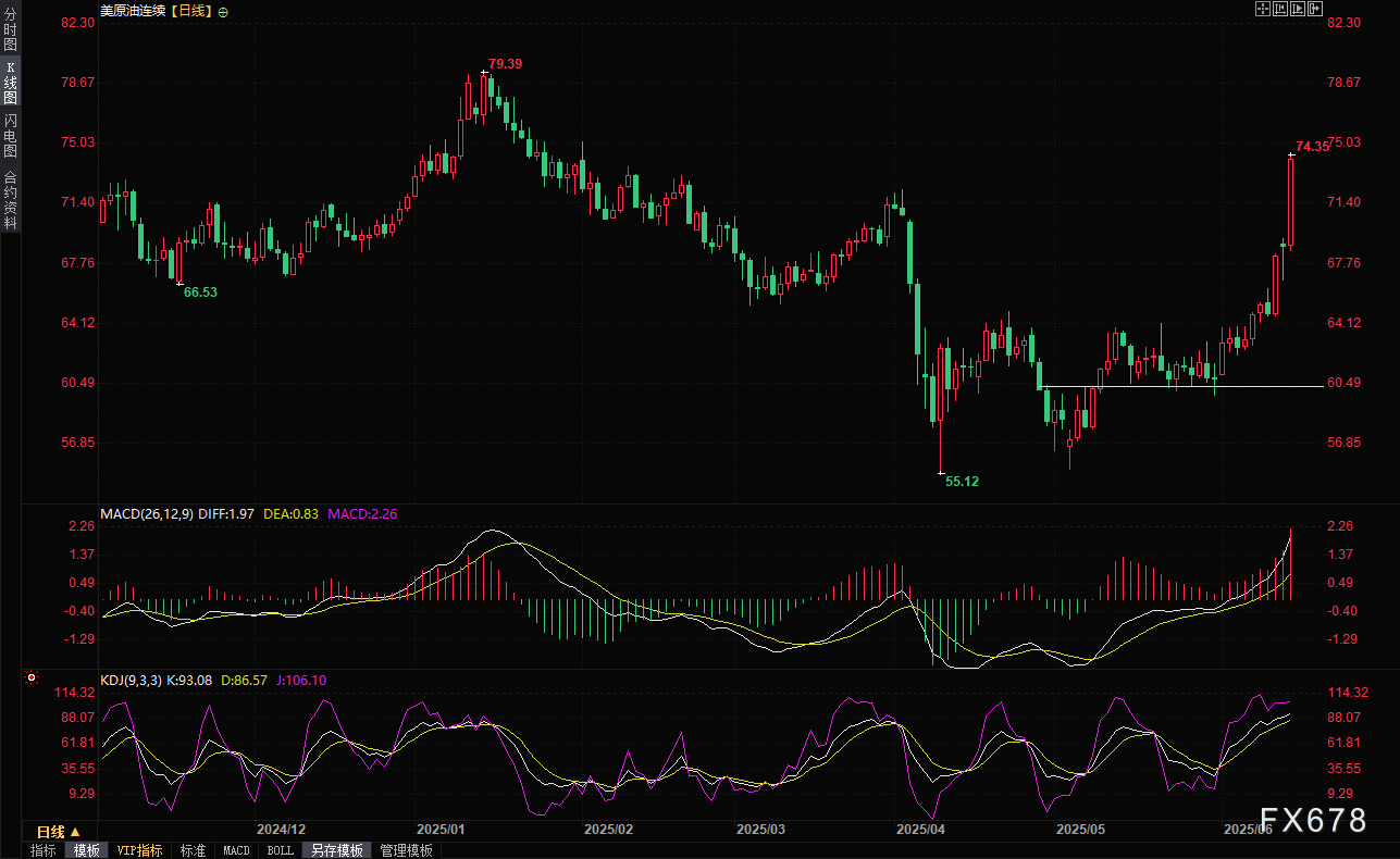 受冲突影响,国际原油和黄金市场出现剧烈波动。截止北京时间10:00,美原油价格一度飙升9.27%,触及每桶74.35美元,为2月3日以来新高;布伦特原油上涨逾7%,达到每桶75.28美元。现货黄金价格也大幅上涨近50美元,达到每盎司3433.18美元,创5月7日以来新高。市场对中东局势进一步恶化的担忧,推动了避险资产和能源价格的快速上涨。