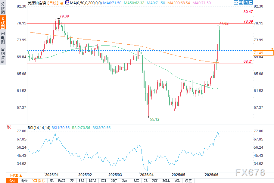 周一(6月16日)欧盘时段,原油期货价格下跌,回吐了早盘涨幅,交易员评估以色列与伊朗新一轮敌对行动对石油生产和出口的有限影响。西德克萨斯中质原油(WTI)短暂反弹至77.49美元,接近上周高点,但未能突破78.09美元附近的关键阻力位。
