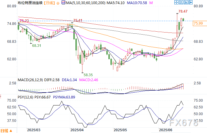 北京时间6月18日14:43 布伦特原油连续 报 76.10美元/桶