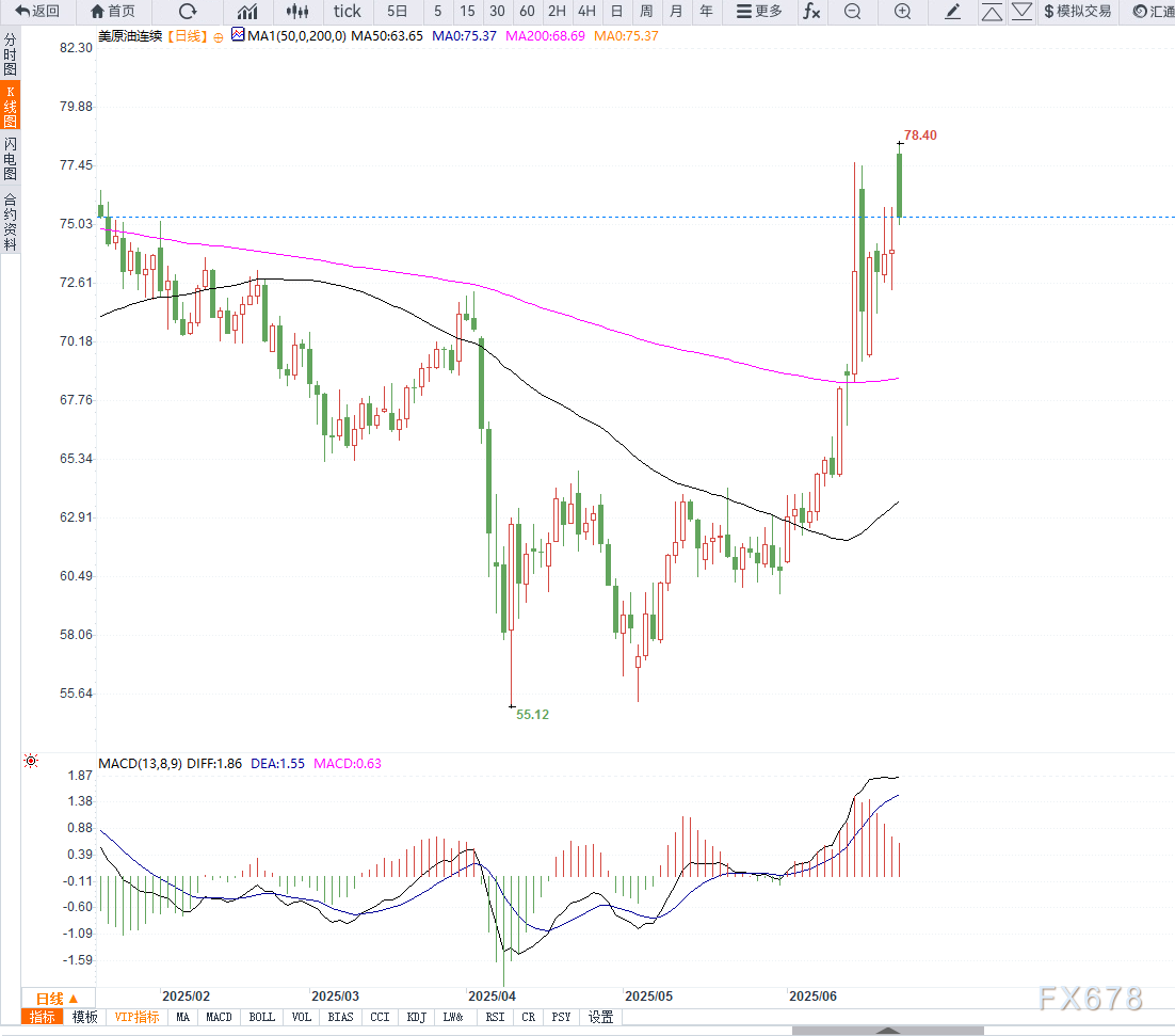 从日线图来看,WTI原油价格自6月中旬低点约72美元反弹,周一盘中一度突破76美元,创下近半年新高,整体维持强势多头格局。