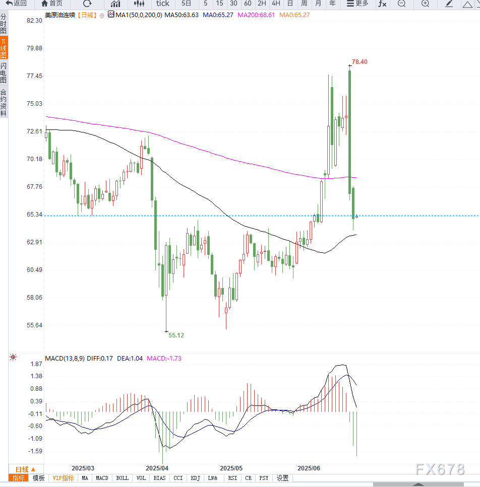 美原油(WTI)日线图显示,油价在65美元关口获得支撑。前两日的快速回调令技术指标偏空,但当前K线开始收出下影线,MACD绿柱减弱,显示下跌动能放缓。