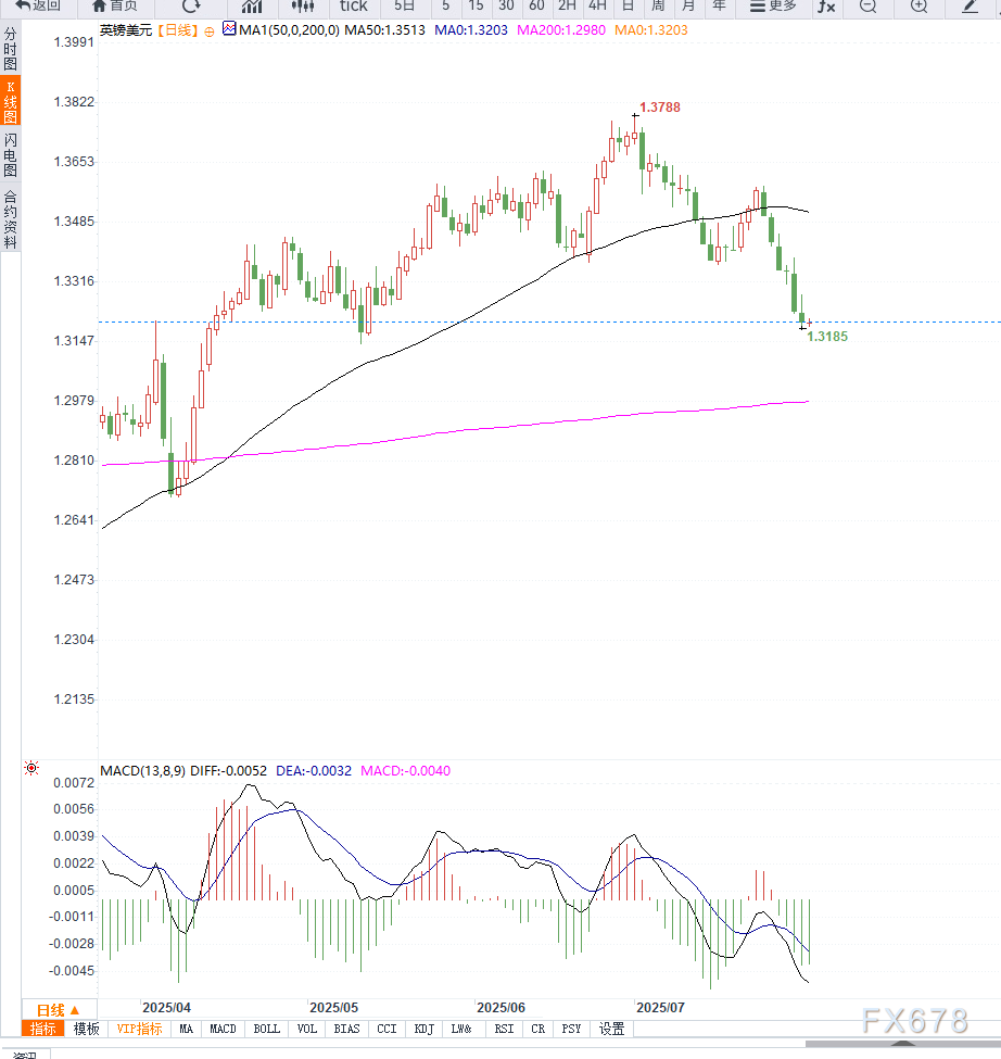 日线图上,GBP/USD已跌破短期支撑位1.3220,当前测试1.3180-1.3190区域。若失守该位,下方关注关键支撑位1.3140与50日均线附近1.3085。上方阻力位仍在1.3250与1.3300区域,短线反弹空间受限,需美数据配合。